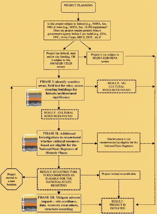 | Base flow chart from page 3 of the New York Archaeology Council publication entitled: CULTURAL RESOURCE STANDARDS HANDBOOK Click chart to access handbook. |